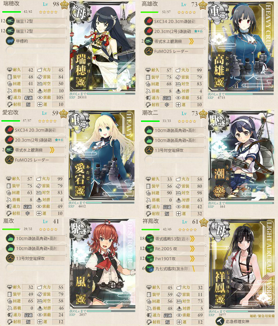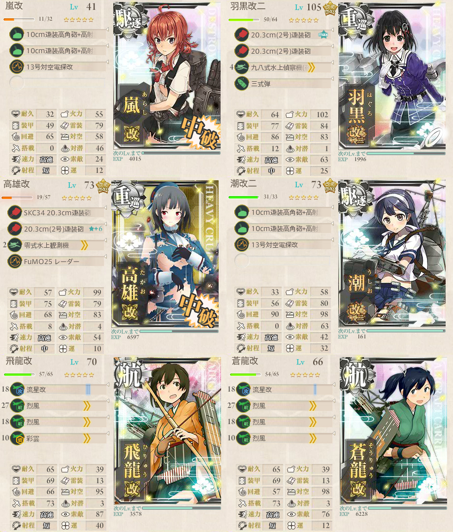 削り時の編成、史実艦のみで構成で火力に乏しいため、通常はボスでもSを取れストレートでゲージ破壊手前まできたのですが、最終編成になった時に相手のタ級戦艦に全滅の憂き目に遭い、20回ぐらい出撃しても芽が無さそうだったので変更しました。