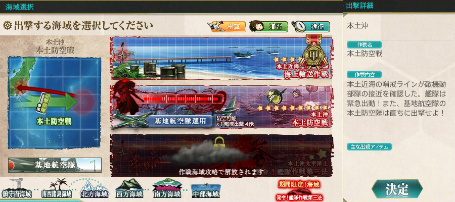 ただ前回と仕様が少し異なるようになったみたいで、このエリアから使える基地航空隊2部隊を両方とも出撃にしても、片方は強制的に休息か待機になるようです。